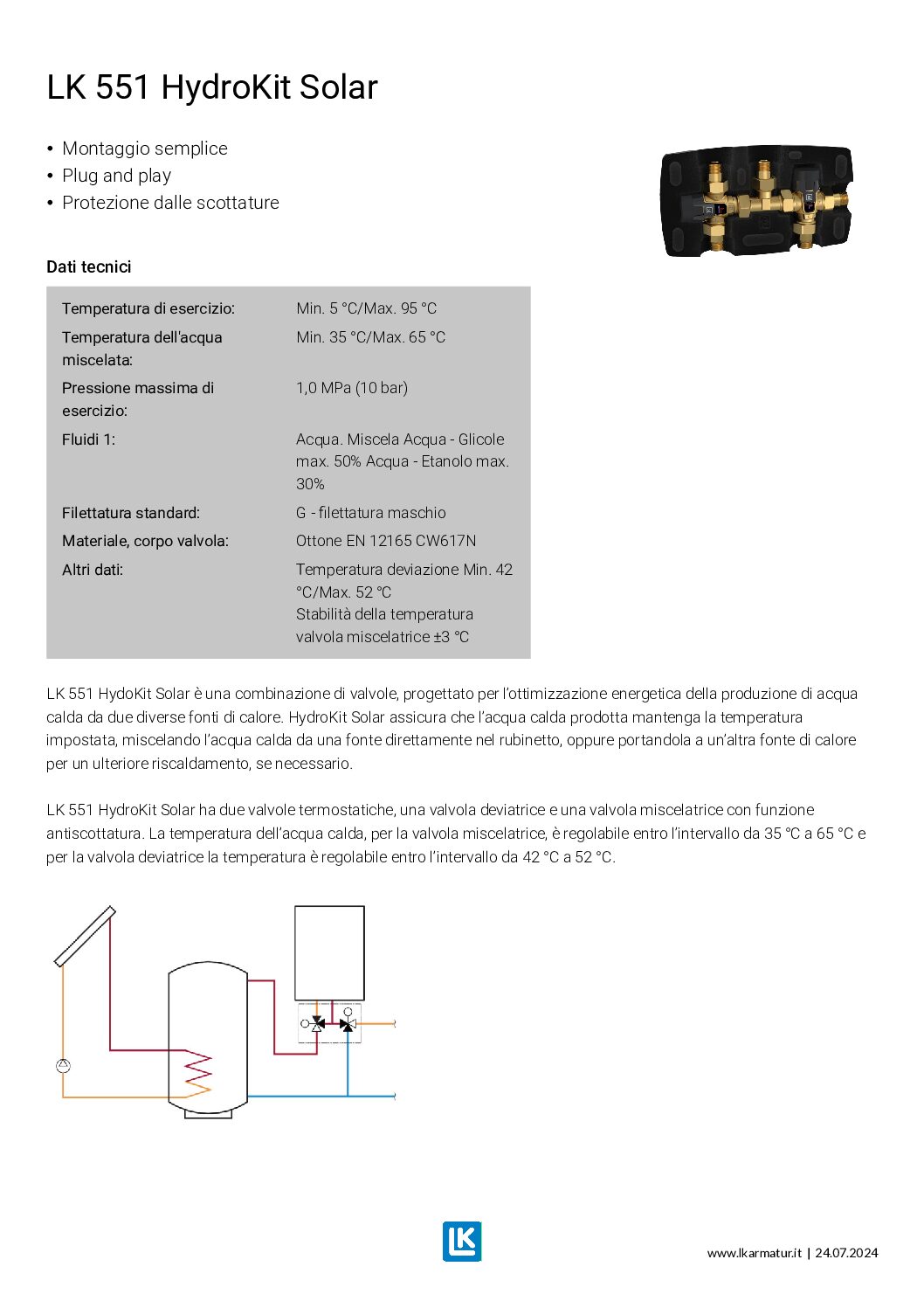 Kit collegamento circuito solare con la caldaia, con deviatrice regolabile e miscelatore termostatico marca Emmeti